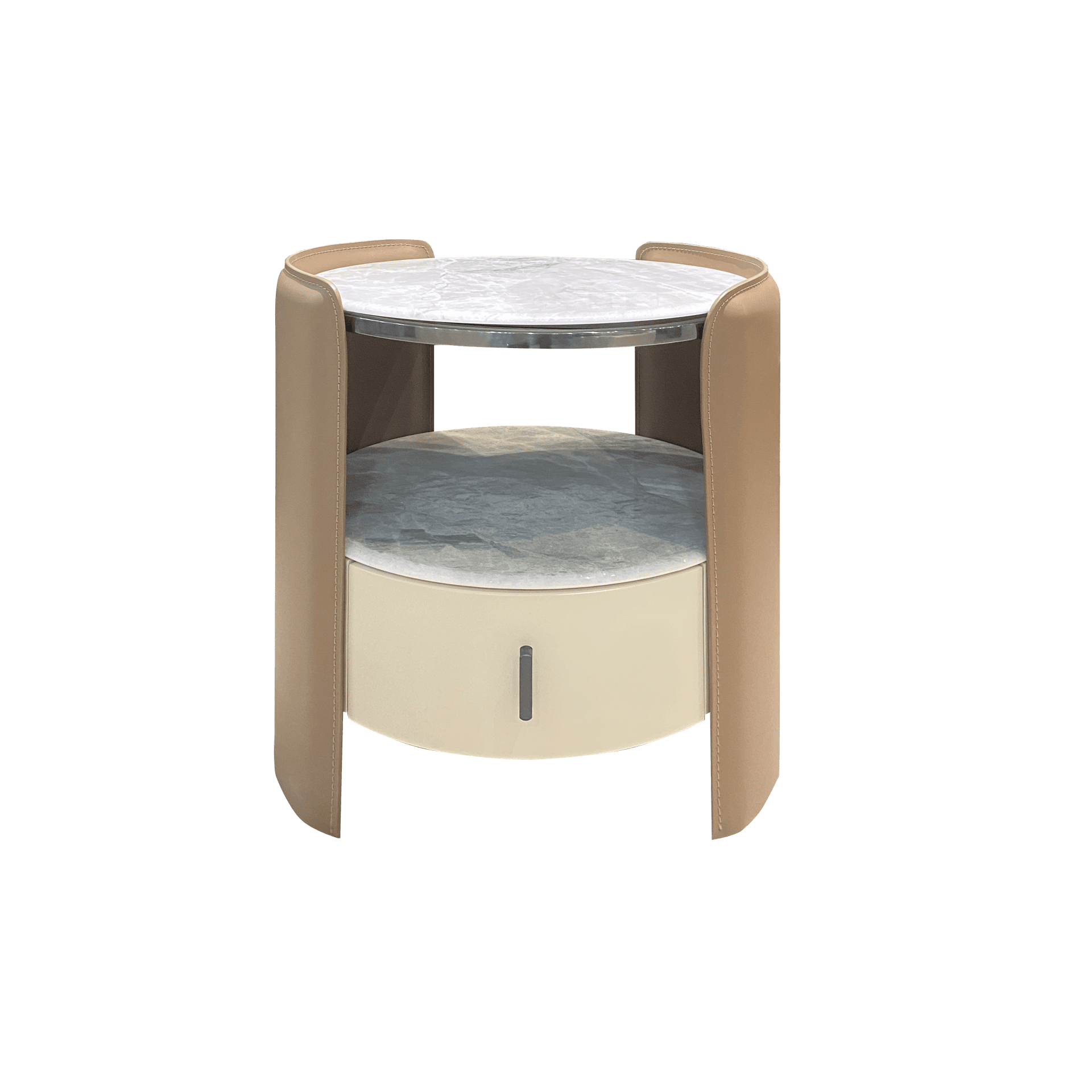 1. โต๊ะข้างเตียง รุ่น ST137 หน้าโต๊ะทรงกลม ด้านข้างหุ้มด้วยหนังPU เกรดพรีเมียม ลุคหรูมีระดับ งานหนังละเอียด - Top หินสวย หรู ยกระดับทันที - ลิ้นชัก Soft Close ปิดนุ่ม เงียบ ไม่กระแทก