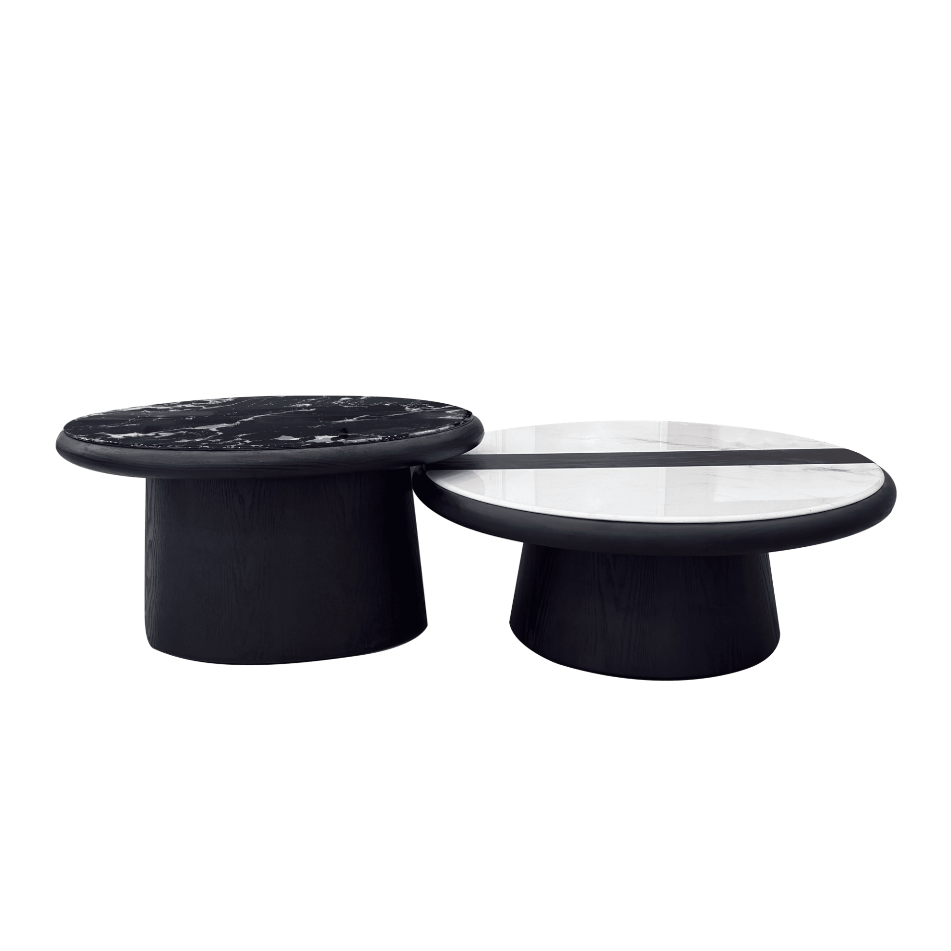 COFFEE TABLE รุ่น CJ2206 ขนาด: 90x34(ชิ้น1) / 80x60x45cm(ชิ้น2) วัสดุ&สี: หินเทียมทรงกลม / ขาไม้ สี: ดำ